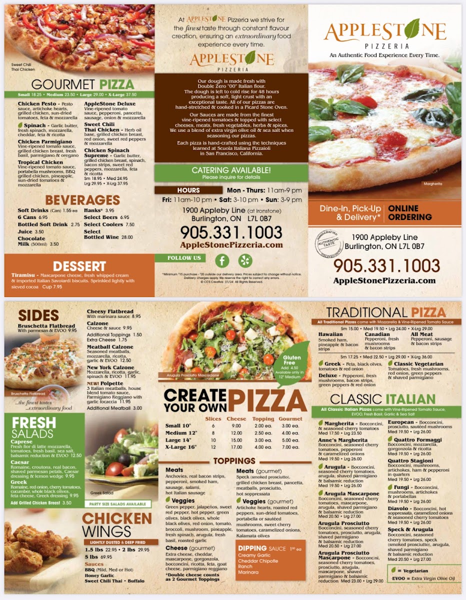Overall, Applestone Pizzeria’s menu is a delightful combination of classic and creative options, all crafted with fresh ingredients and a passion for great pizza. Whether you're in the mood for a simple slice or a gourmet experience, this menu has something to satisfy every craving.